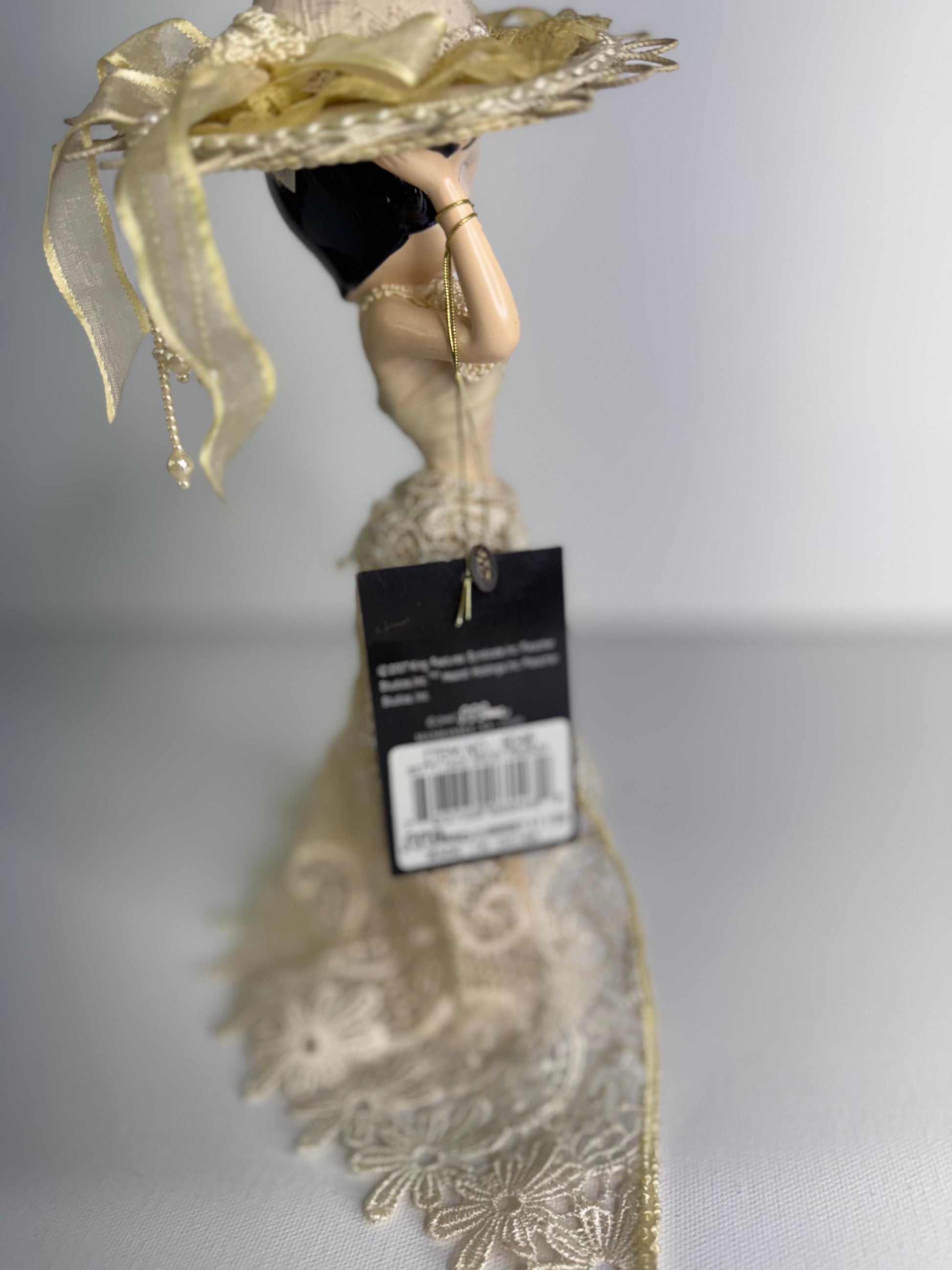 Elegant Betty Boop resin figurine featuring Betty in a cream lace dress with a long train, wide-brim hat and matching little purse. She stands on a round base in high heels with pearl-style accents in her outfit – a glamorous vintage-style display piece.