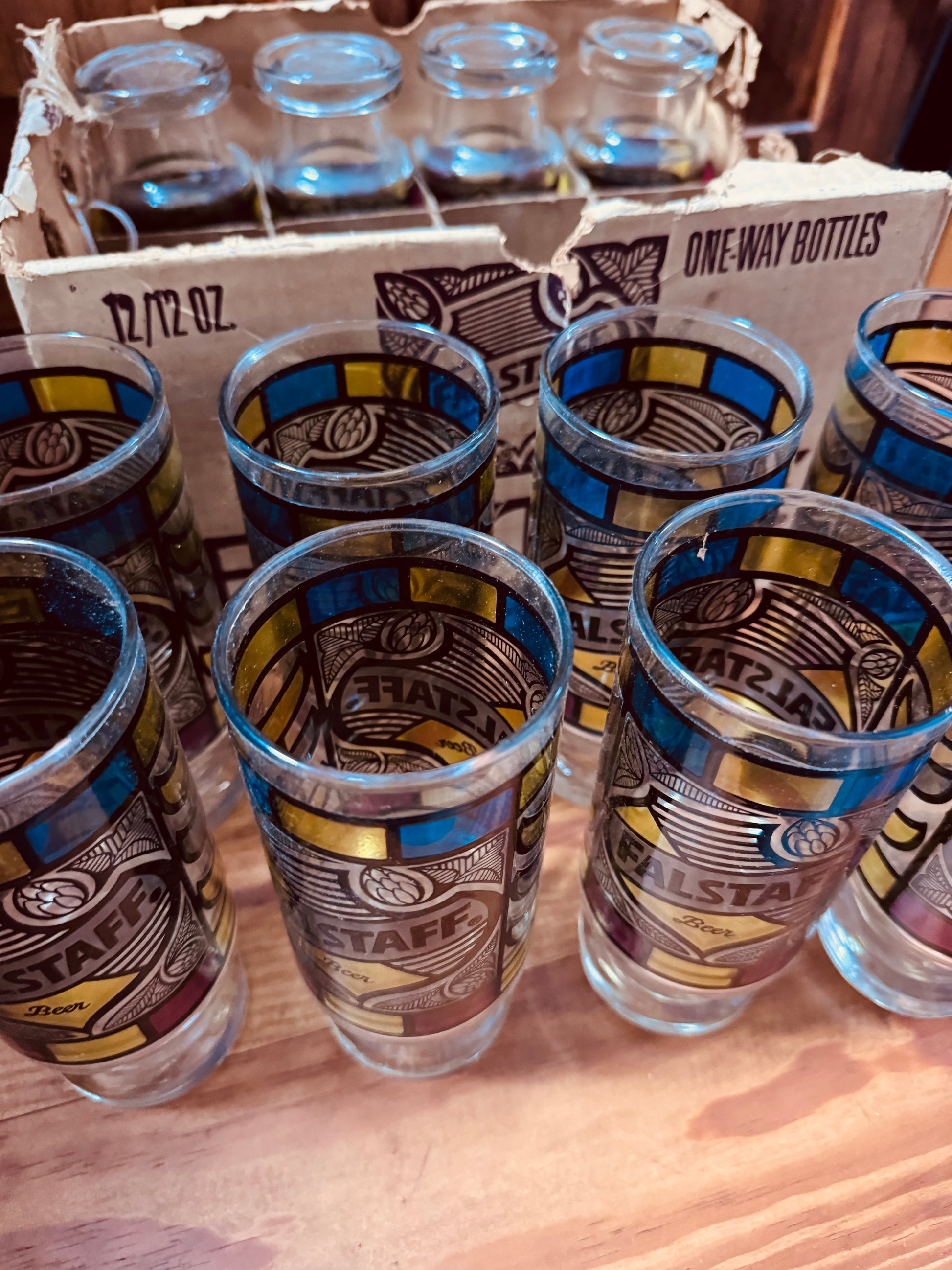 Turn your bar into a true Falstaff showpiece with this complete vintage glassware set.