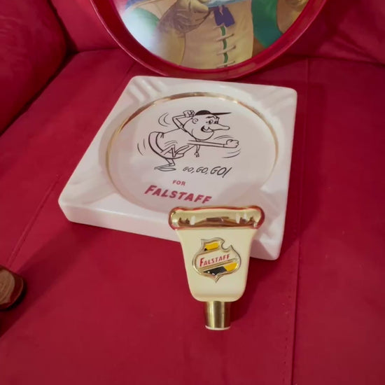 Falstaff ceramic ashtray with “GO, GO, GO! for FALSTAFF” artwork