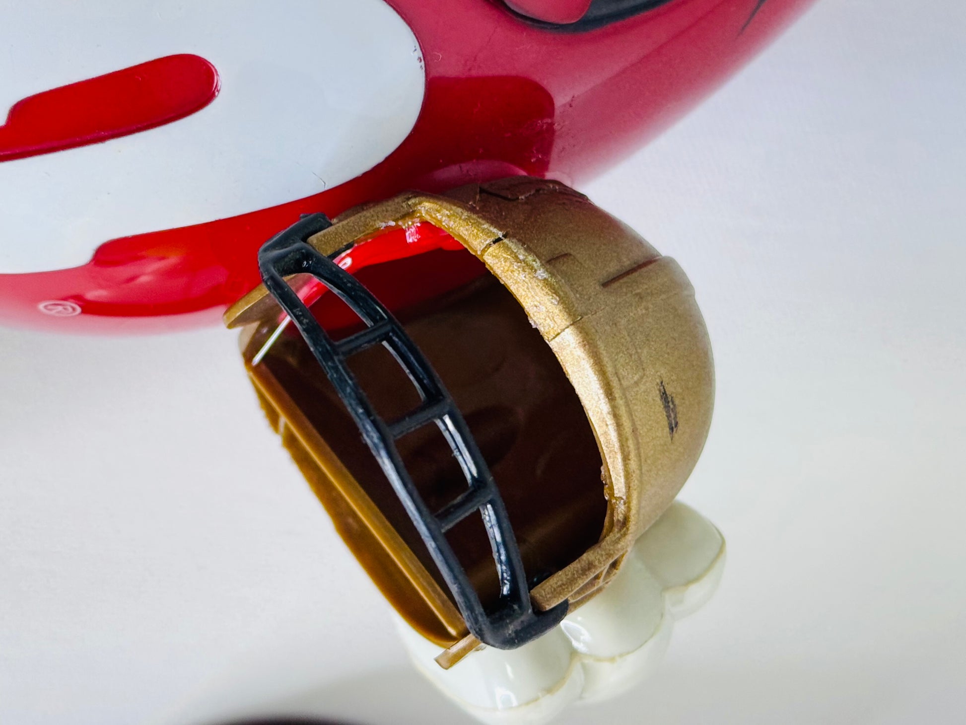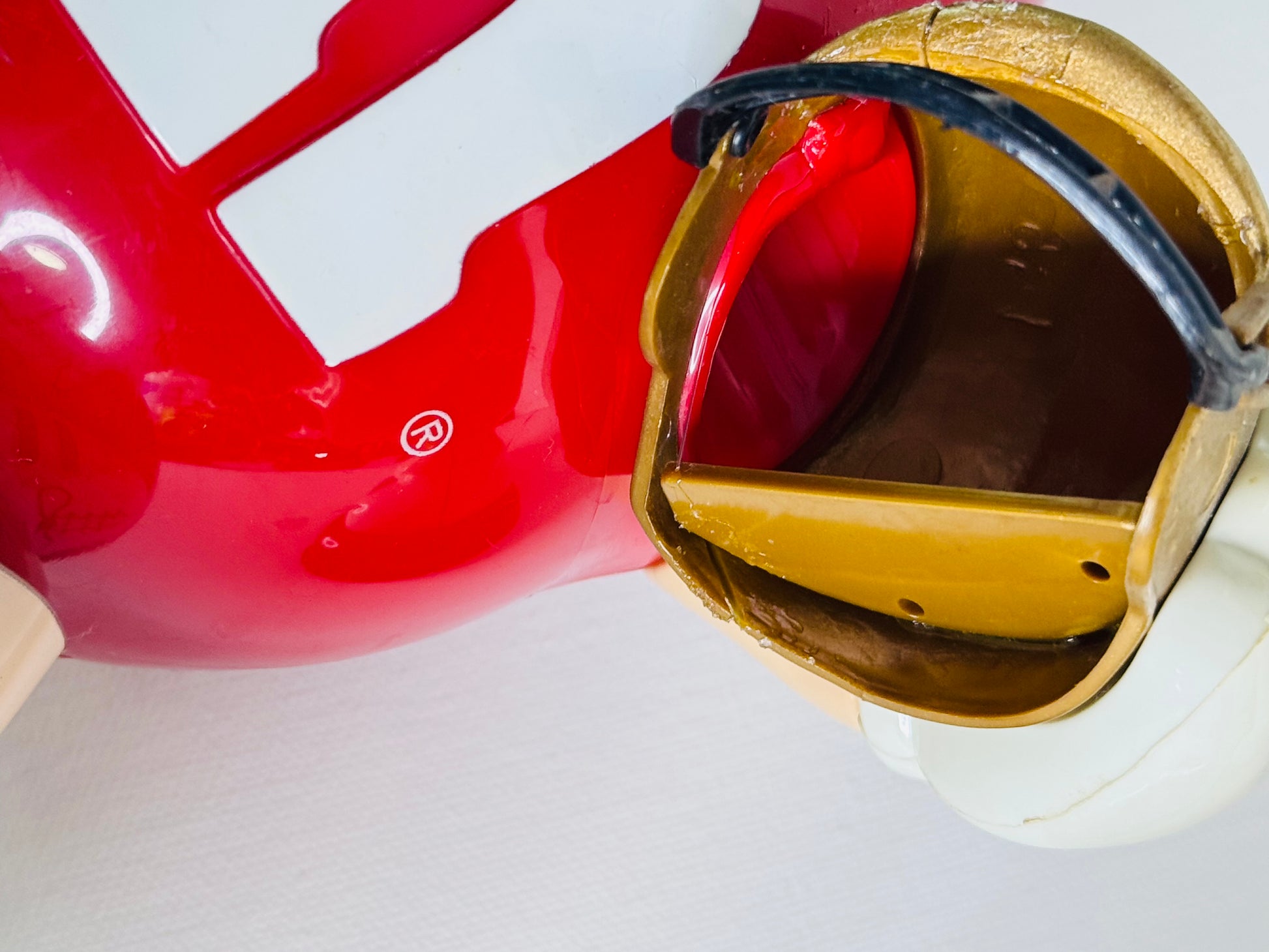 Red M&M – football player, standing on a green base and holding a football and helmet.